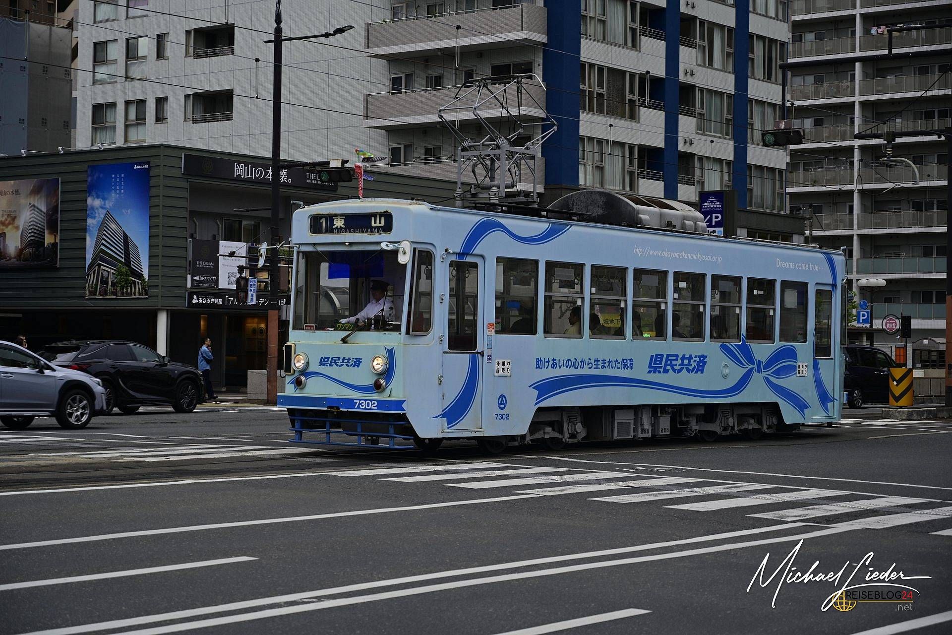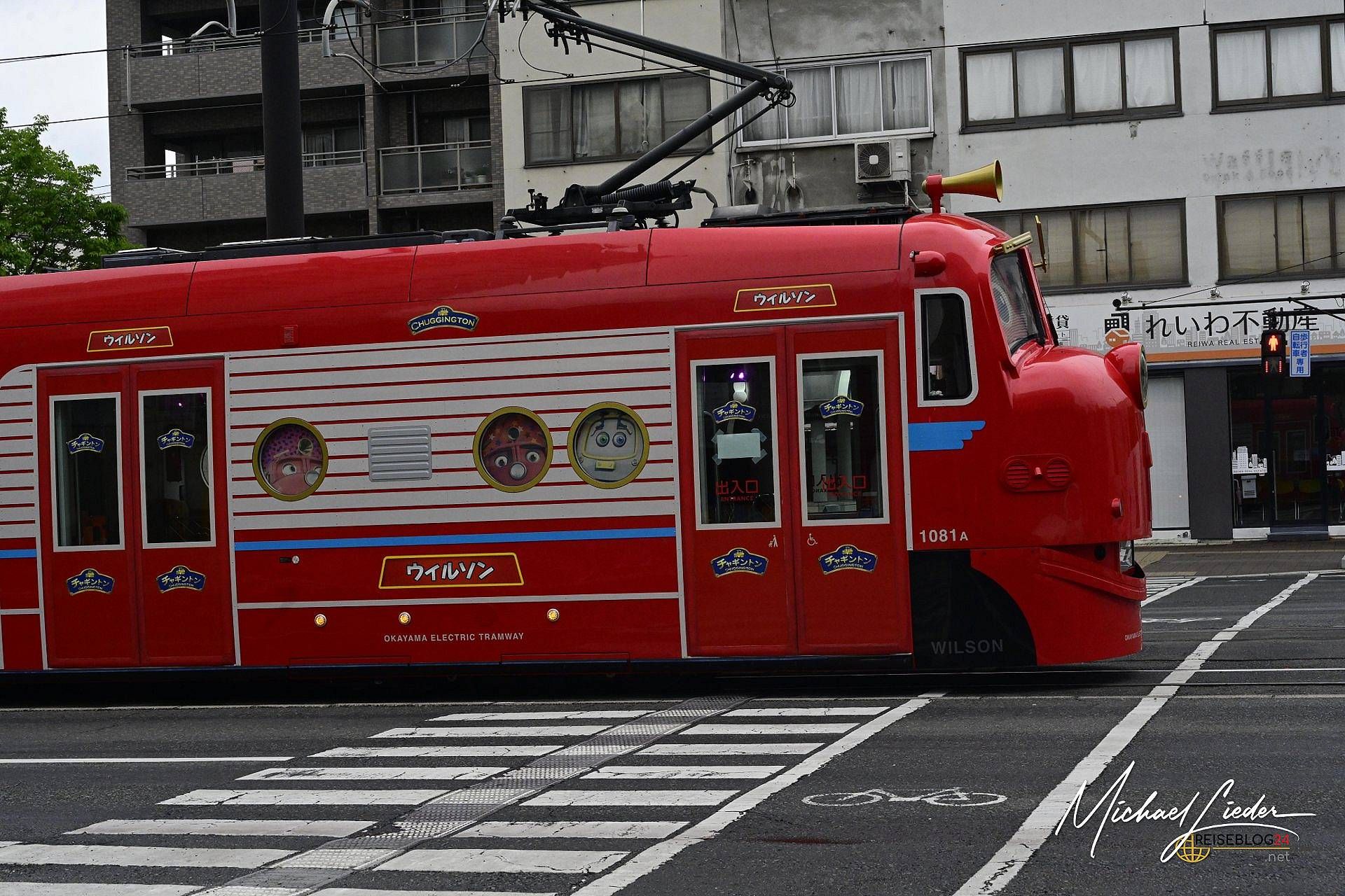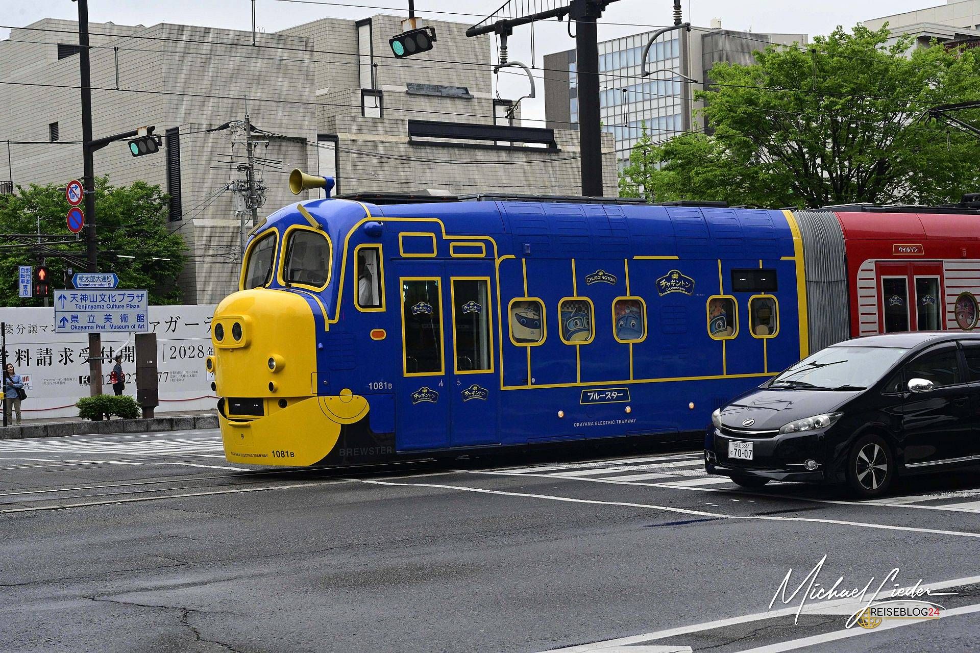 Die Straßenbahnen von Okayama sind nicht nur praktisch, sondern auch kunterbunt und individuell gestaltet – manche sind mit Anime-Figuren, andere mit traditionellen Mustern bemalt. Ein echtes Fotomotiv!