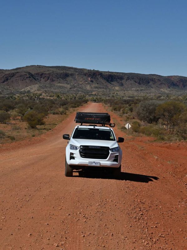 Nur im Geländewagen mit hoher Durchfahrtshöhe fahren wir von hier aus weiter entlang der Schotterpiste Mereenie Loop Road zum Kings Canyon. Du solltest dich unbedingt vorher nach dem Straßenzustand erkundigen, denn über diesen kann man keine immer gültige Aussage treffen: Was an einem Tag eine etwas ungefährliche Piste ist, kann sich am nächsten Tag in einen unpassierbaren See verwandelt haben. Da die Route durch Aboriginal Gebiet führt, benötigt man einen Mereenie Loop Road Pass. Diesen solltest du im Voraus besorgen: in Alice Springs beim Visitor Information Centre oder in Hermannsburg (bei der Tankstelle), beim Glen Helen Resort oder im Kings Canyon Resort (AUD 5, dafür bekommt man eine kleine Gebietskarte und eine Broschüre).