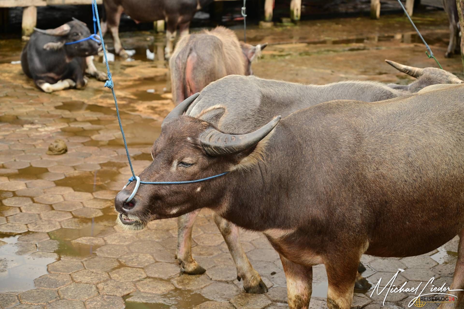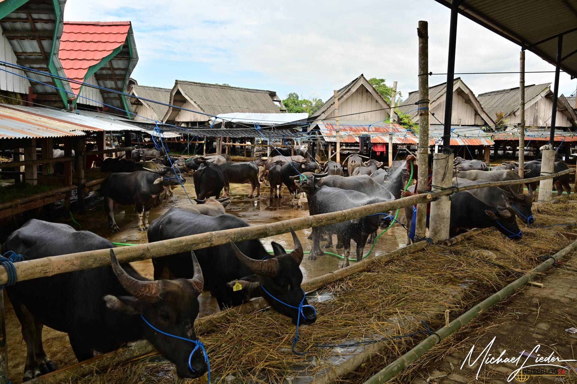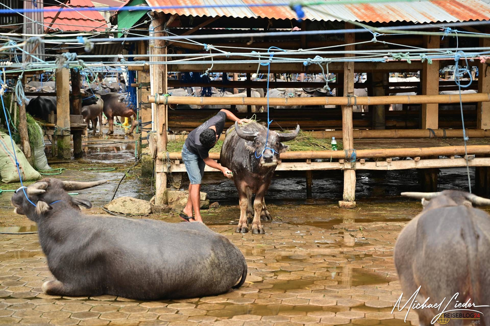 Wir beobachten fasziniert das Feilschen der Händler, während sie Wasserbüffel, Schweine und andere Waren verkaufen. Tauchen ein in die Farben, Gerüche und Klänge dieses einzigartigen Marktes. Interessant ist auch der Umgang mit den Tieren, sie werden so weit wir es beobachten konnten respektvoll behandelt. Keine Hektik, kein Schlagen oder treten sieht man hier auf dem Markt. Die Wasserbüffel werden sogar regelmäßig geduscht und sogar gewaschen um einen guten Eindruck auf die neuen Besitzer zu machen. Die meisten von den Wasserbüffeln und Schweinen haben einen langen Weg hinter sich und kommen aus anderen Regionen Sulawesis oder werden gar aus den umliegenden Ländern importiert. Nicht nur für die Beerdigungszeremonien werden sie hier verkauft, auch als Arbeitstiere, zur Zucht oder als Kapitalanlagen sind die riesigen Büffel gedacht.