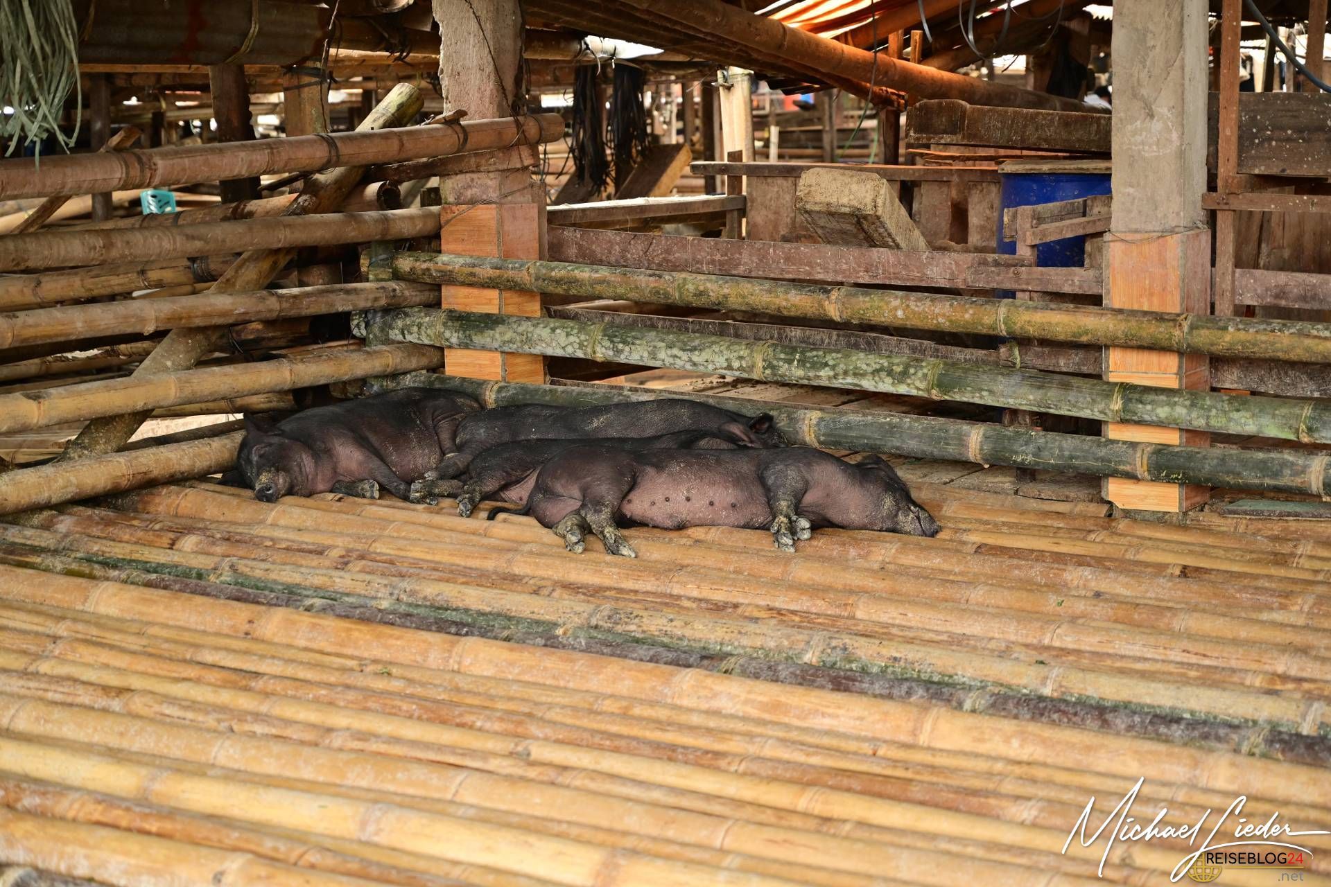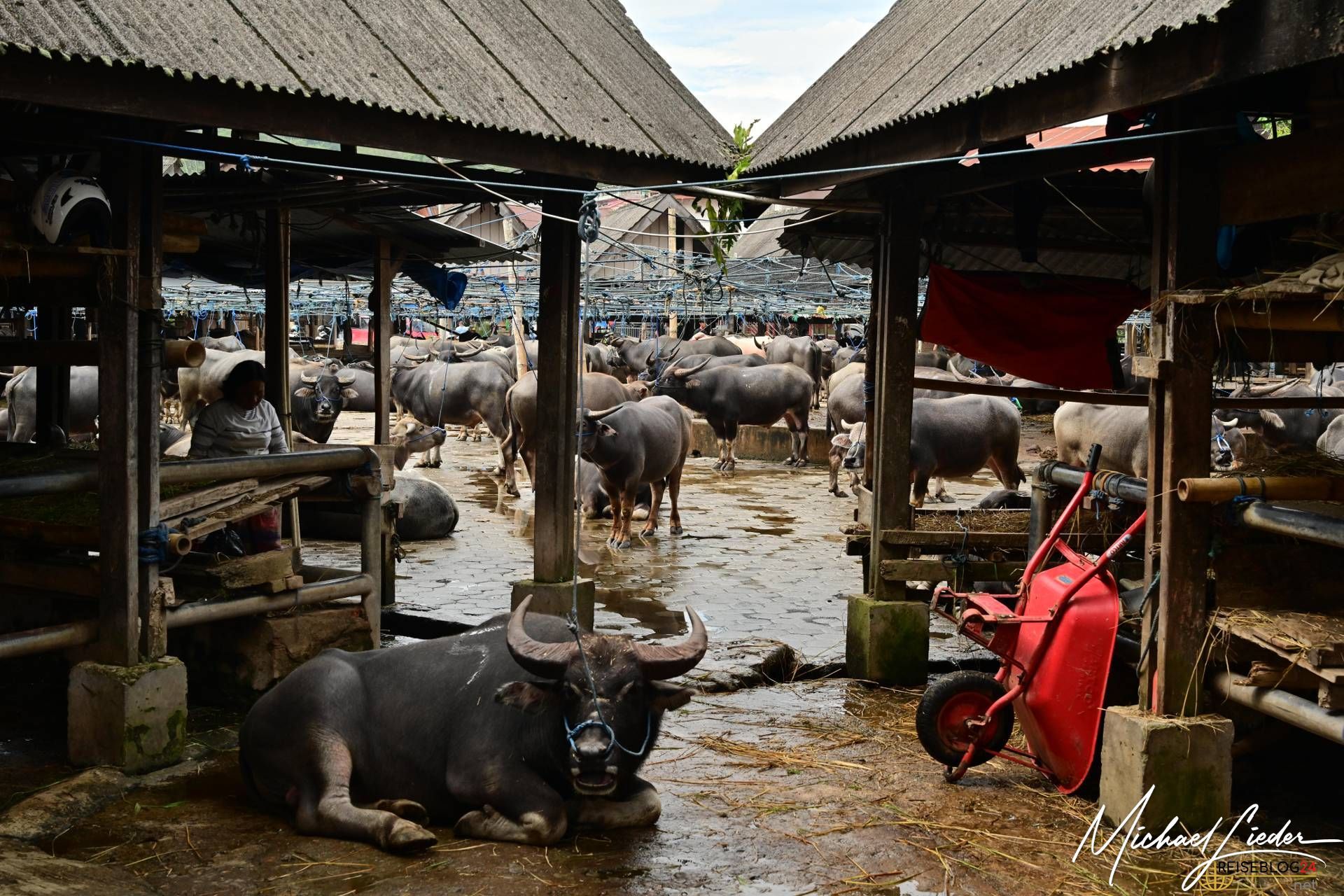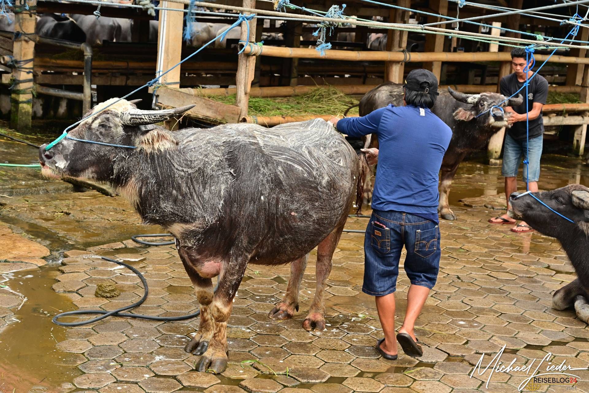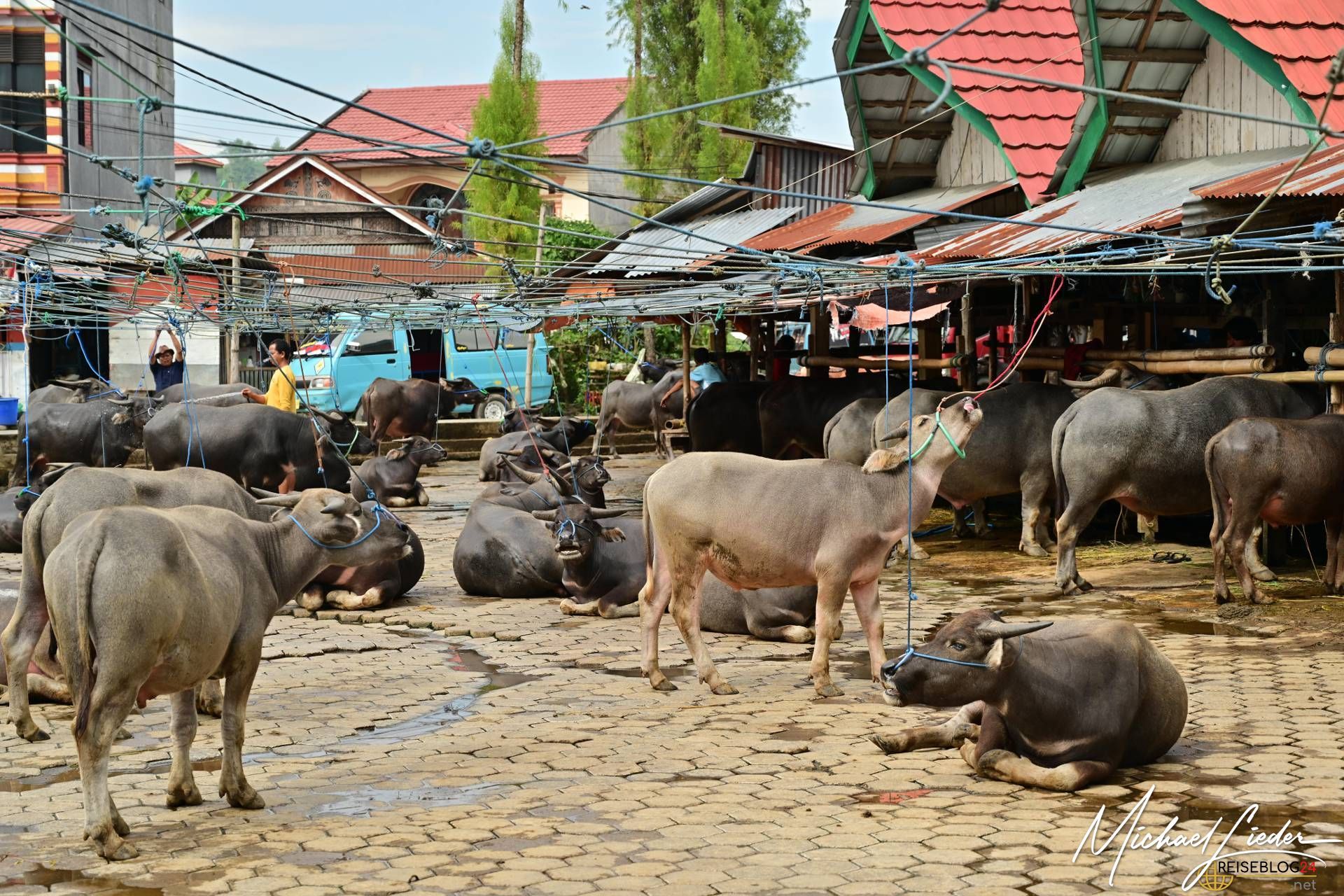 Wir beobachten fasziniert das Feilschen der Händler, während sie Wasserbüffel, Schweine und andere Waren verkaufen. Tauchen ein in die Farben, Gerüche und Klänge dieses einzigartigen Marktes. Interessant ist auch der Umgang mit den Tieren, sie werden so weit wir es beobachten konnten respektvoll behandelt. Keine Hektik, kein Schlagen oder treten sieht man hier auf dem Markt. Die Wasserbüffel werden sogar regelmäßig geduscht und sogar gewaschen um einen guten Eindruck auf die neuen Besitzer zu machen. Die meisten von den Wasserbüffeln und Schweinen haben einen langen Weg hinter sich und kommen aus anderen Regionen Sulawesis oder werden gar aus den umliegenden Ländern importiert. Nicht nur für die Beerdigungszeremonien werden sie hier verkauft, auch als Arbeitstiere, zur Zucht oder als Kapitalanlagen sind die riesigen Büffel gedacht.