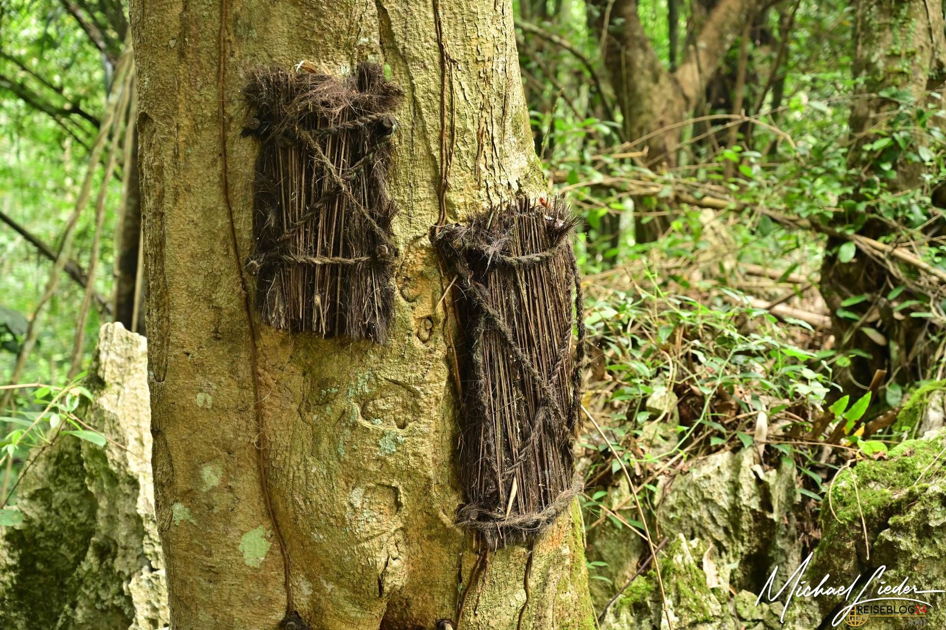 Diese Bäume, oft Gummibäume, gelten als heilig. Der milchige Kautschuk, der aus ihnen fließt, wird als eine Art Fortsetzung der Muttermilch gesehen – ein sanfter Übergang von der irdischen in die spirituelle Welt.