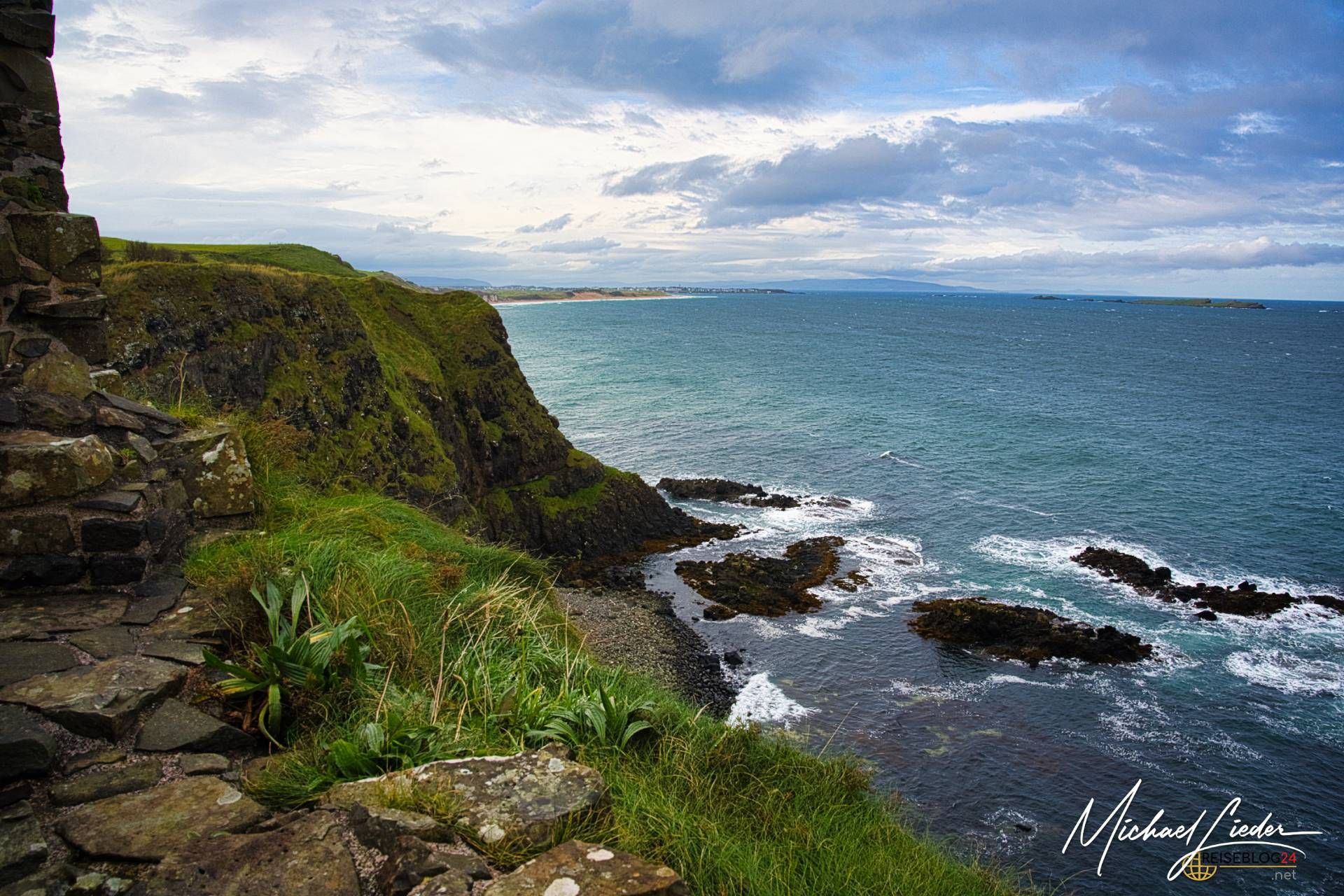 Es gibt diese Momente auf einem Roadtrip, da verstummt selbst der innere Kommentator. Genau so ein Moment war das hier. Dank der klaren Fernsicht konnten wir tatsächlich bis zu den schottischen Inseln schauen – nicht nur geografisch, sondern auch gedanklich. Die Welt lag plötzlich weit offen vor uns. Unter den Füßen das stürmische Blau des Atlantiks, darüber ein Himmel, der aussah, als hätte er extra für diesen Tag Überstunden gemacht. Dazwischen sattes Grün, schroffe Klippen und Mauern, die mehr Geschichte tragen, als in so manches Geschichtsbuch passt.