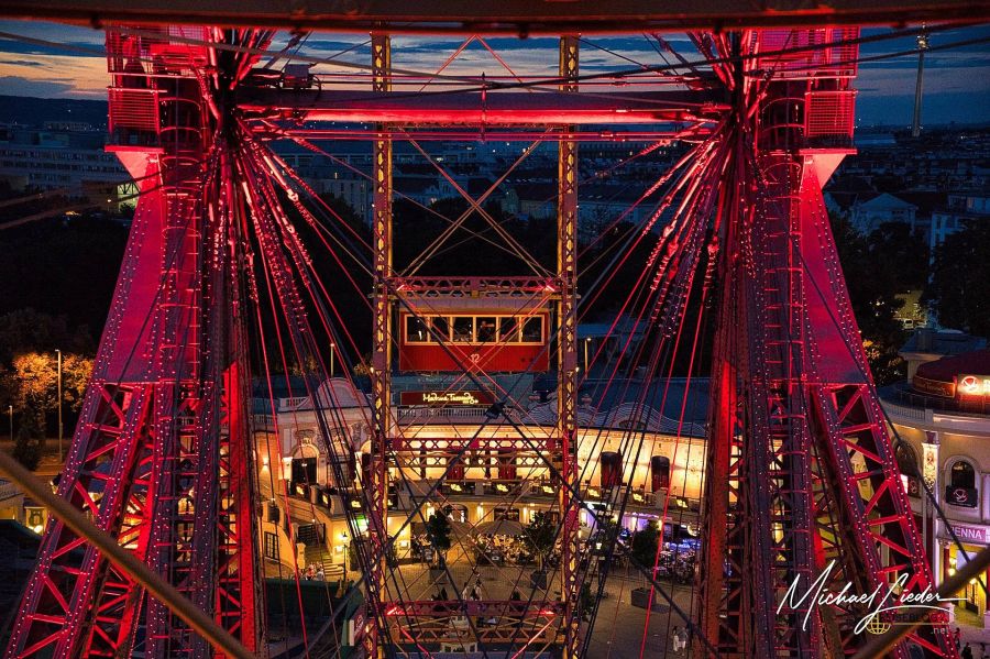 Oben angekommen, bot sich uns ein atemberaubender Blick über das nächtlich glitzernde Wien und das bunte Treiben des Praters. Die Lichter, die Musik, das ausgelassene Stimmengewirr – alles wirkte wie eine Szene aus einem nostalgischen Film. Das Wiener Riesenrad, eines der ältesten noch in Betrieb befindlichen seiner Art, hat eine ganz besondere Magie.