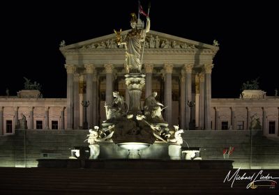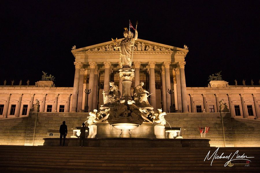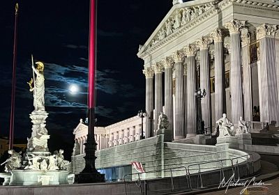 Unser Spaziergang führt uns weiter am imposanten Parlamentsgebäude vorbei, das in der Nacht eine ganz eigene Magie entfaltet. Die kunstvolle Beleuchtung taucht die neoklassizistischen Säulen in warmes Licht, und als wäre die Szenerie nicht schon kitschig genug, steht auch noch der Vollmond perfekt am Himmel. Ein Anblick, der direkt aus einem Wiener Märchen stammen könnte.