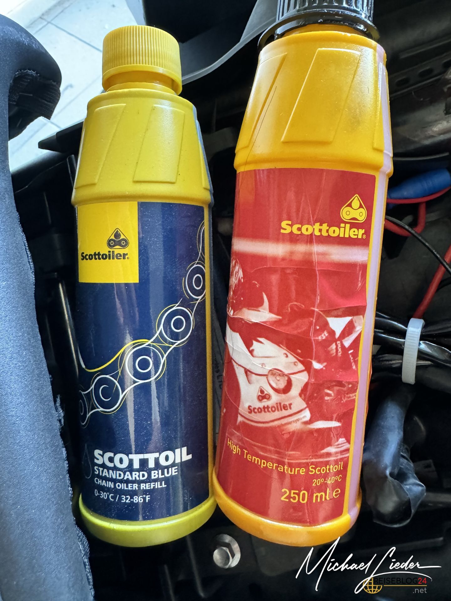 Hier siehst du die beiden Scottoil-Varianten: Das blaue Öl ist für Temperaturen von 0 und 30 °C geeignet, während das etwas dickere Sommeröl in der roten Flasche für Temperaturen zwischen 20 und 40 °C gedacht ist. Die beiden Flaschen reichen je nach Nutzung für 1-2 Jahre, abhängig davon, wie oft du unterwegs bist. Auch auf Motorradtouren sind sie bei mir dabei, sie passen problemlos in mein Reisegepäck.