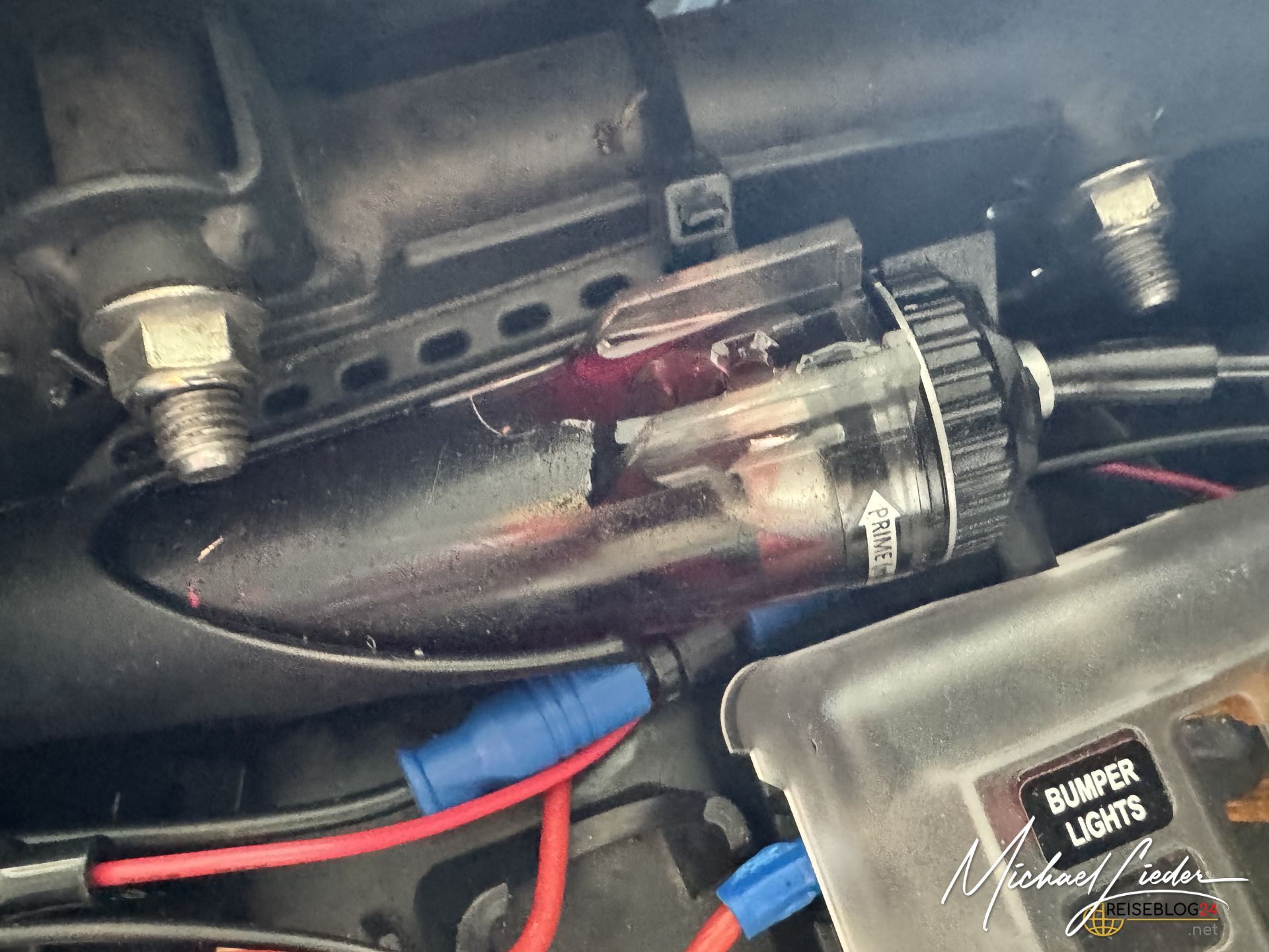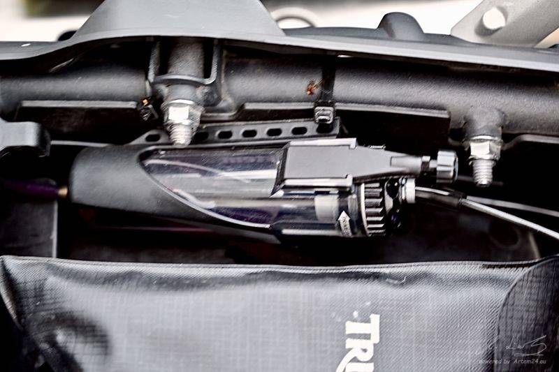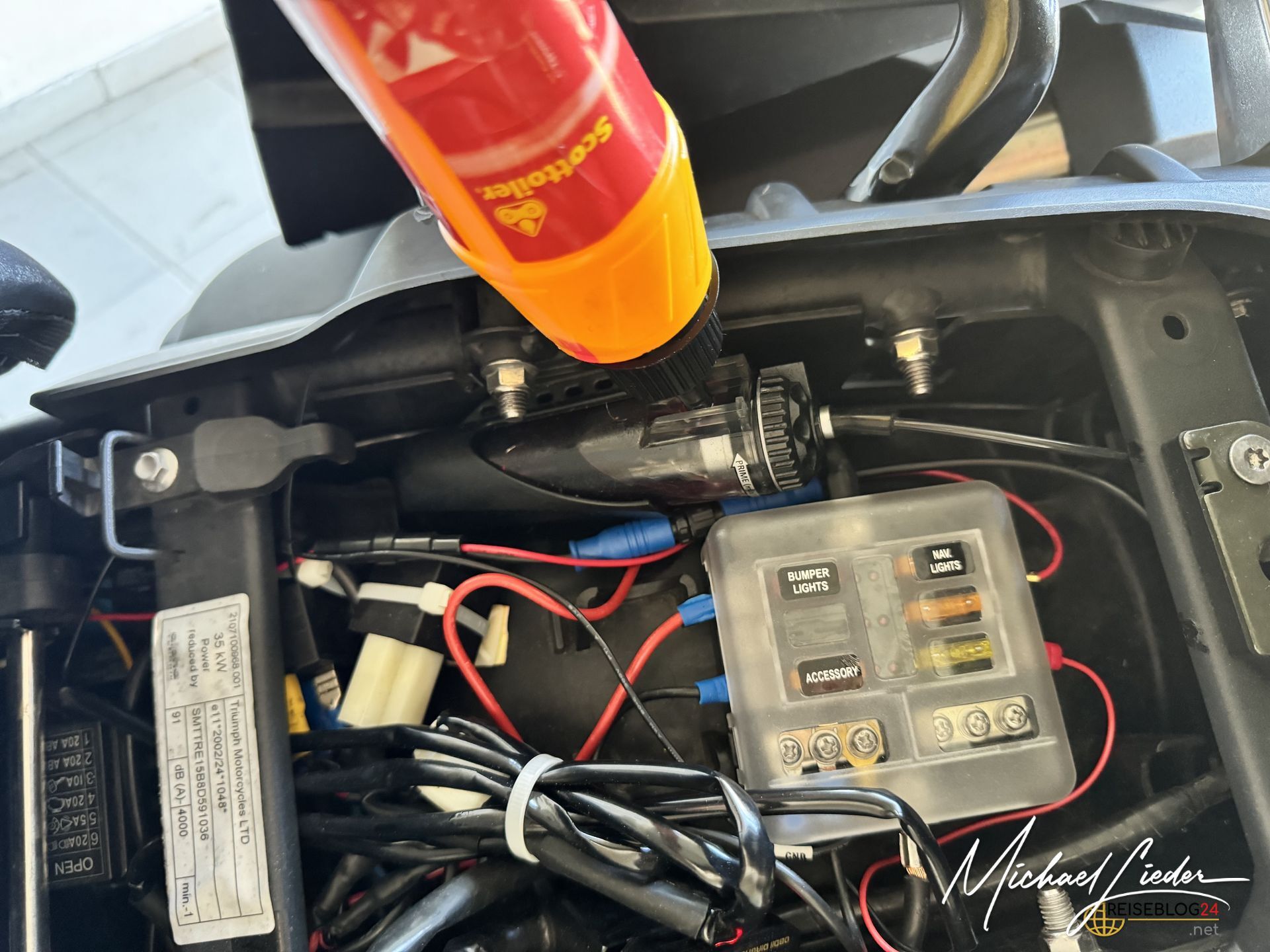 In meinem 800er Tiger habe ich einen guten Platz direkt unter der hinteren Sitzbank gefunden. Das Reservoir mit seinem Ölvorrat konnte hier optimal am Rahmen befestigt werden. Auch das Nachfüllen von Öl ist problemlos möglich.