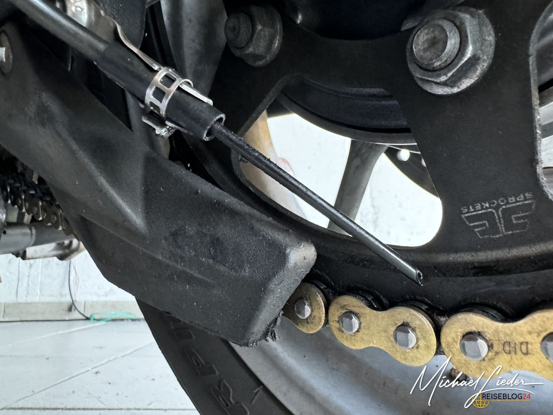 Auf dem beigefügten Bild sieht man übrigens meine Kette, die ausschließlich mit dem Scottoiler gepflegt wird. Sie hat mittlerweile beeindruckende 20.000 Kilometer auf verschiedenen Straßen und Schotterwegen hinter sich, immer in Begleitung meiner Tiger. Trotz der hohen Kilometerleistung und den teils anspruchsvollen Bedingungen ist kaum Verschleiß an der Kette zu erkennen. Der Pflegeaufwand war minimal – abgesehen vom regelmäßigen Nachfüllen des Reservoirs war keine zusätzliche Wartung notwendig. Dieses Ergebnis spricht für sich und unterstreicht die herausragende Qualität und Effektivität des Scottoilers.