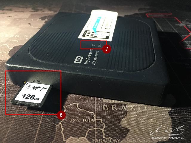 Neben dem SD-Karten Lesen gibt es auch einen USB 2.0 Port (3) über diesen können exotische Kartenformate mit einem Adapter auf die Festplatte übertragen werden. Durch den langsameren USB-Port dauert die Datenübertragung naturgemäß ein bisschen länger, dafür kann man aber auch eine Kamera oder einen externen Speicher direkt über den USB-Port mit der externen Festplatte verbinden. Bei meiner Nikon wurde der interne Speicher sofort erkannt und die Daten konnten übertragen werden. Sehr schön gelöst finde ich das für jeden angeschlossenen Datenträger, egal ob es eine Kamera oder einer SD-Karte ist, wird ein eigener Ordner auf der Festplatte angelegt, sodass man unterwegs und zu Hause genau im Bilde ist was wann wo übertragen wurde. Die externe Festplatte hat auch die Möglichkeit über Wireless (WLAN) (7) die Übertragung auszuführen oder auch Daten wiederzugeben, sodass auch diese Möglichkeit abgedeckt ist. Ich verwende die WLAN-Funktion am liebsten mit meinem Smartphone oder Tablett, wenn ich zwischendurch Aufnahmen gemacht habe, die ich sichern möchte. Über die Wireless Funktion lassen sich übrigens auch Filme und Fotos auf externe Gerätes streamen.