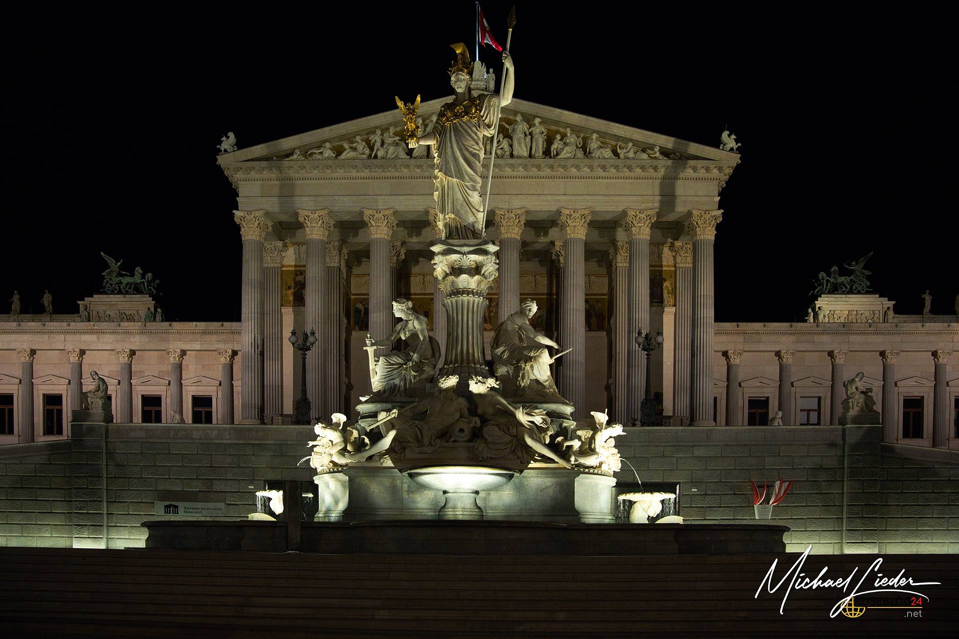 Unser Spaziergang führt uns weiter am imposanten Parlamentsgebäude vorbei, das in der Nacht eine ganz eigene Magie entfaltet. Die kunstvolle Beleuchtung taucht die neoklassizistischen Säulen in warmes Licht, und als wäre die Szenerie nicht schon kitschig genug, steht auch noch der Vollmond perfekt am Himmel. Ein Anblick, der direkt aus einem Wiener Märchen stammen könnte.