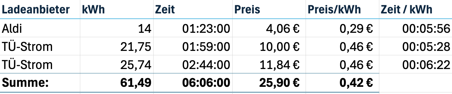 Erster Halt: Aldi. Dort gibt’s Strom für sensationelle 0,29 € pro kWh – allerdings mit maximal 1,5 Stunden Standzeit. Also brav den Timer gestellt, Kaffee geholt, innerlich schon auf die nächsten Ladepunkte geschielt. Pünktlich umgeparkt zur nächsten Station: TÜ-Strom. Immerhin 0,46 €/kWh – noch okay, wenn auch ohne Discounterflair.