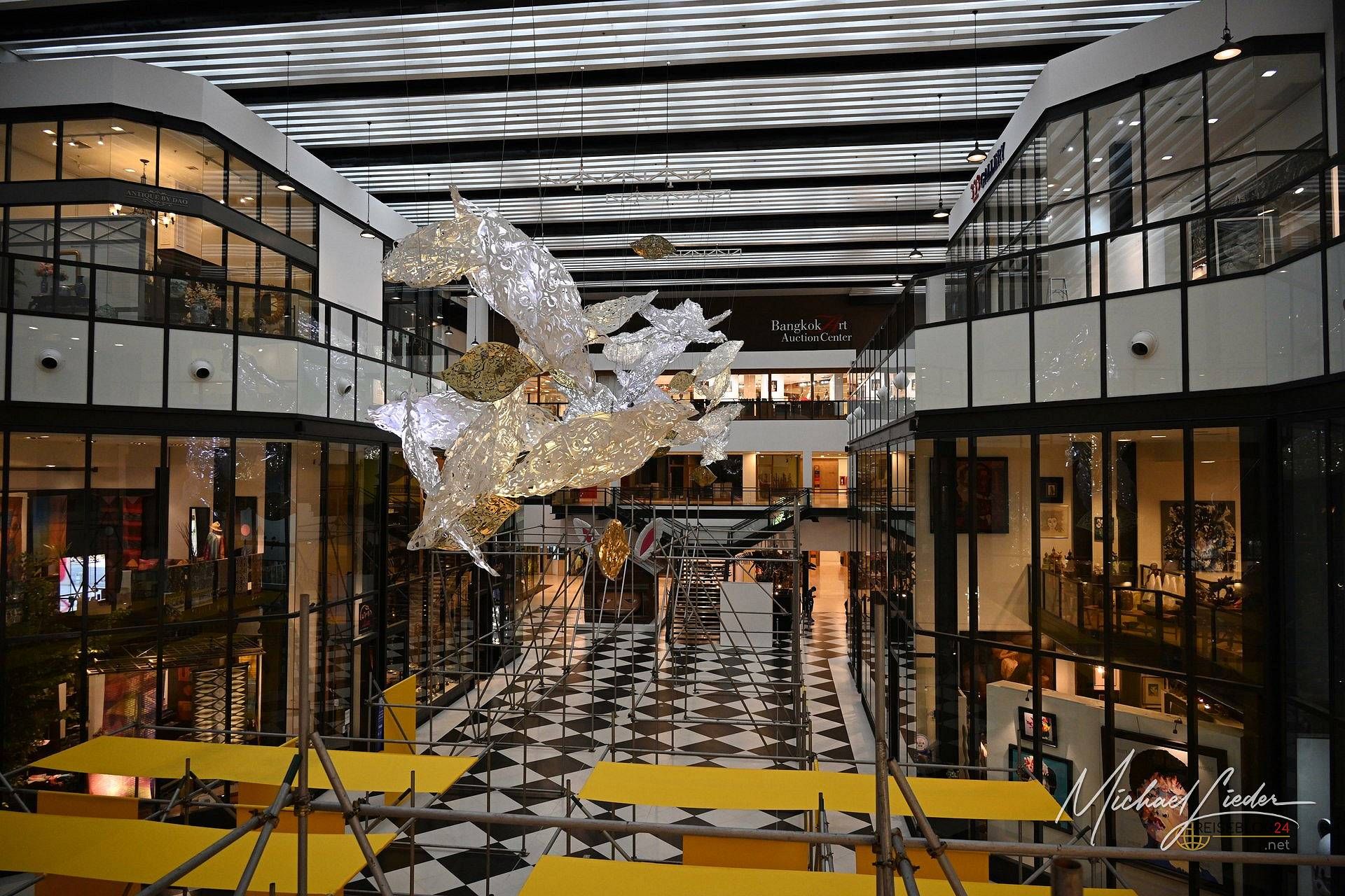 River City Bangkok ist so ein Ort, an dem Bangkok kurz den Gang rausnimmt und dabei erstaunlich kultiviert wirkt. Ein Lifestyle-Zentrum für Kunst, Antiquitäten und alles, was zwischen Sammelleidenschaft und gepflegter Neugier pendelt. Hier laufen Kunstliebhaber, Galeristen, Sammler und neugierige Spaziergänger durcheinander, ohne sich gegenseitig auf die Füße zu treten. Man schaut Ausstellungen, hört Vorträge, trifft Künstler, stolpert in Filmvorführungen oder bleibt einfach an einer Installation hängen, die größer ist als der eigene Tagesplan. Als ich dort war, füllte eine monumentale Kunstinstallation die untere Ebene. So ein Werk, bei dem man automatisch langsamer geht, obwohl man eigentlich nur schauen wollte.
